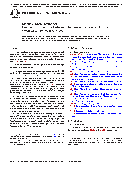 1.1 This specification covers the minimum performance and material requirements for resilient connectors used for connections between reinforced concrete tanks used for septic effluent treatment/detention, including those referenced in Specifications C913 and C1227.