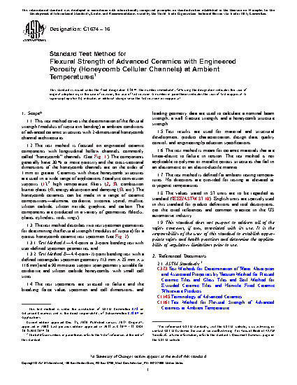 5.1 This test method is used to determine the mechanical properties in flexure of engineered ceramic components with multiple longitudinal hollow channels, commonly described as “honeycomb” channel architectures. The components generally have 30 % or more porosity and the cross-sectional dimensions of the honeycomb channels are on the order of 1 mm or greater.
