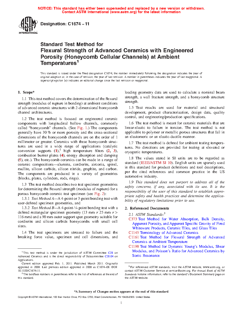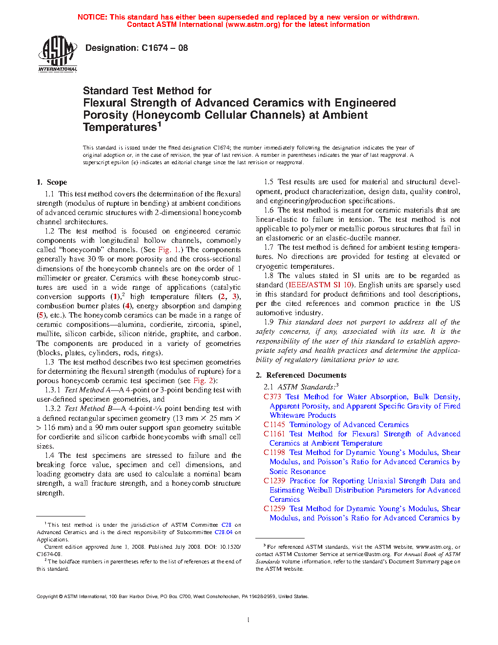 1.2 The test method is focused on engineered ceramic components with longitudinal hollow channels, commonly called “honeycomb” channels. (See Fig. 1.) The components generally have 30 % or more porosity and the cross-sectional dimensions of the honeycomb channels are on the order of 1 mm or greater. Ceramics with these honeycomb structures are used in a wide range of applications (catalytic conversion supports (1),2 high temperature filters (2, 3), combustion burner plates (4), energy absorption and damping (5), etc.). The honeycomb ceramics can be made in a range of ceramic compositions—alumina, cordierite, zirconia, spinel, mullite, silicon carbide, silicon nitride, graphite, and carbon. The components are produced in a variety of geometries (blocks, plates, cylinders, rods, rings).