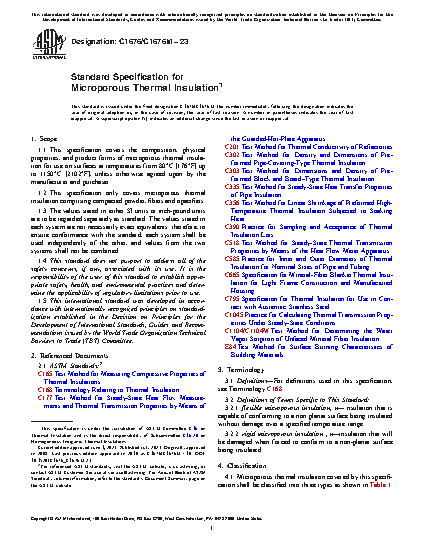 1.1 This specification covers the composition, physical properties, and product forms of microporous thermal insulation for use on surfaces at temperatures from 80°C [176°F] up to 1150°C [2102°F], unless otherwise agreed upon by the manufacturer and purchaser.