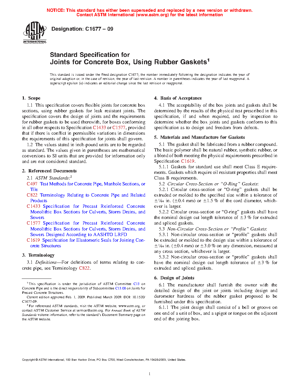 This specification covers flexible joints for concrete box sections, using rubber gaskets for leak resistant joints. The specification covers the design of joints and the requirements for rubber gaskets to be used. The gasket shall be fabricated from a rubber compound. The basic polymer shall be natural rubber, synthetic rubber, or a blend of both meeting the physical requirements prescribed. Gasket volume determination, non-circular shape gasket stretch height, and gasket length test methods shall be performed to determine the physical properties of the gastket in accordance with specified requirements. These test methods cover procedures for the mechanical testing of wrought and cast steels, stainless steels, and related alloys. Tension, bend, Rockwell hardness, portable hardness, brinell, and charpy impact tests shall be performed in accordance to specified requirements.