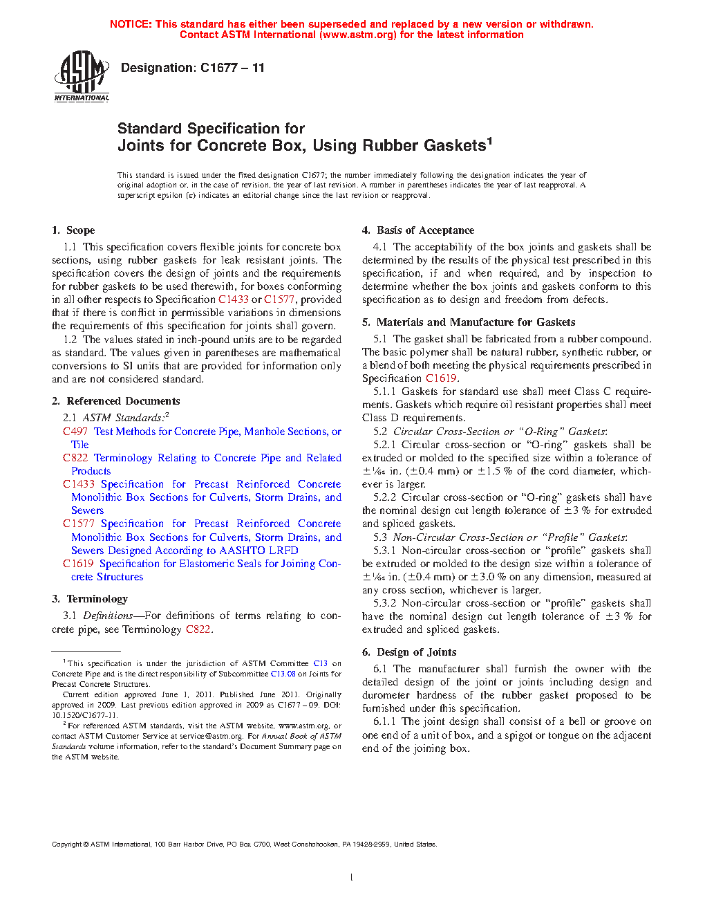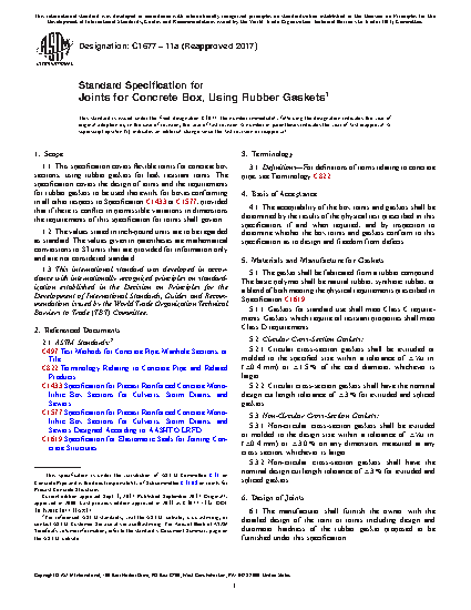1.1 This specification covers flexible joints for concrete box sections, using rubber gaskets for leak resistant joints. The specification covers the design of joints and the requirements for rubber gaskets to be used therewith, for boxes conforming in all other respects to Specification C1433 or C1577, provided that if there is conflict in permissible variations in dimensions the requirements of this specification for joints shall govern.