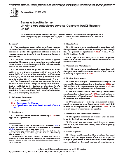 1.1 This specification covers solid, unreinforced masonry units manufactured from autoclaved aerated concrete (AAC), a cementitious product. This specification addresses dimensional tolerances, maximum limits for drying shrinkage, and shipping and handling.