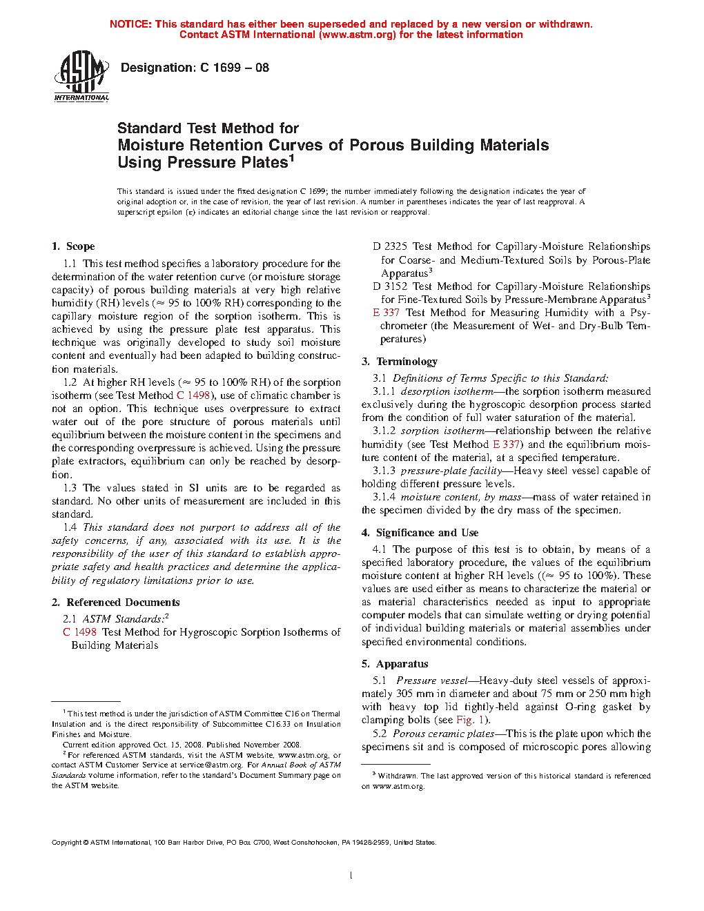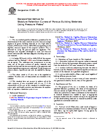 1.2 At higher RH levels (≈ 95 to 100% RH) of the sorption isotherm (see Test Method C1498), use of climatic chamber is not an option. This technique uses overpressure to extract water out of the pore structure of porous materials until equilibrium between the moisture content in the specimens and the corresponding overpressure is achieved. Using the pressure plate extractors, equilibrium can only be reached by desorption.