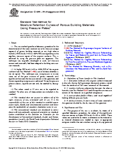 1.1 This test method specifies a laboratory procedure for the determination of the water retention curve (or moisture storage capacity) of porous building materials at very high relative humidity (RH) levels (≈ 95 to 100% RH) corresponding to the capillary moisture region of the sorption isotherm. This is achieved by using the pressure plate test apparatus. This technique was originally developed to study soil moisture content and eventually had been adapted to building construction materials.