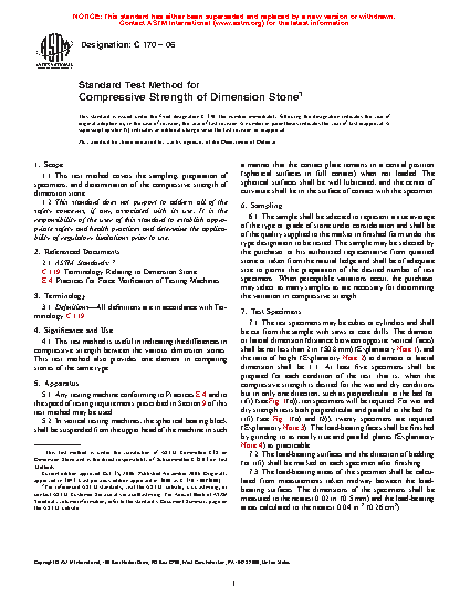 1.1 This test method covers the sampling, preparation of specimens, and determination of the compressive strength of dimension stone.