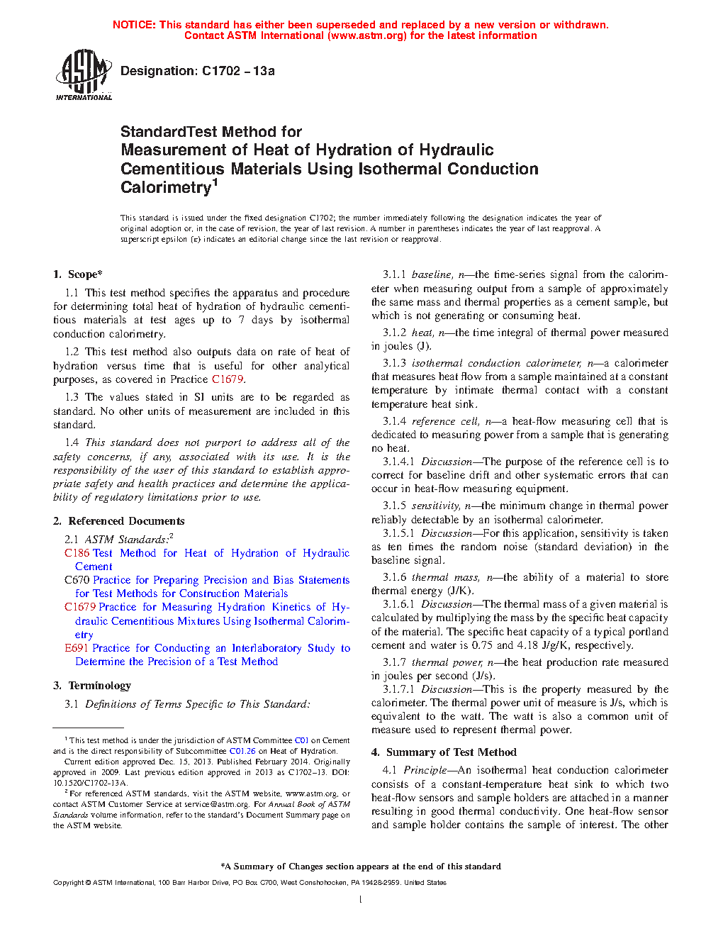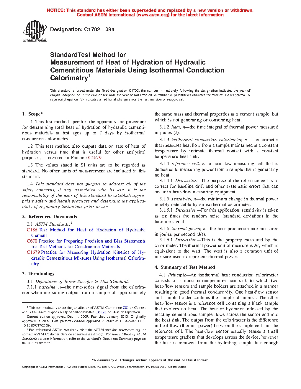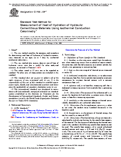 1.1 This test method specifies the apparatus and procedure for determining total heat of hydration of hydraulic cementitious materials at test ages up to 7 days by isothermal conduction calorimetry.