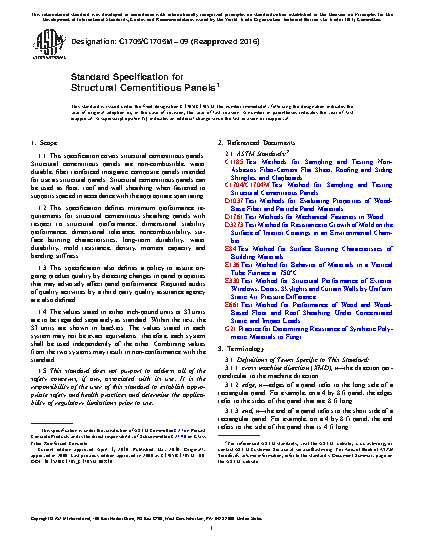 This specification covers structural cementitious panels and defines minimum performance requirements for structural cementitious sheathing panels with respect to structural performance, dimensional stability performance, dimensional tolerance, noncombustibility, surface burning characteristics, long-term durability, water durability, mold resistance, density, moment capacity, and bending stiffness. Structural cementitious panels are non-combustible, water durable, fiber reinforced inorganic composite panels that can be used as floor, roof, and wall sheathing when fastened to supports spaced in accordance with the appropriate span rating. Qualification procedures and initial testing methods shall be conducted to demonstrate the performance characteristics of the panels. Statistical analysis shall also be performed for sampling and inspection of the panel samples.