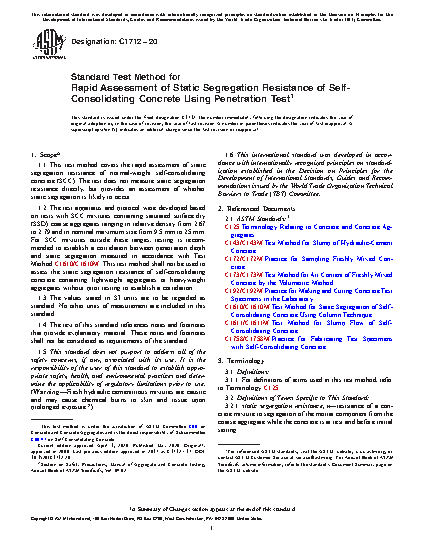 1.1 This test method covers the rapid assessment of static segregation resistance of normal-weight self-consolidating concrete (SCC). The test does not measure static segregation resistance directly, but provides an assessment of whether static segregation is likely to occur.