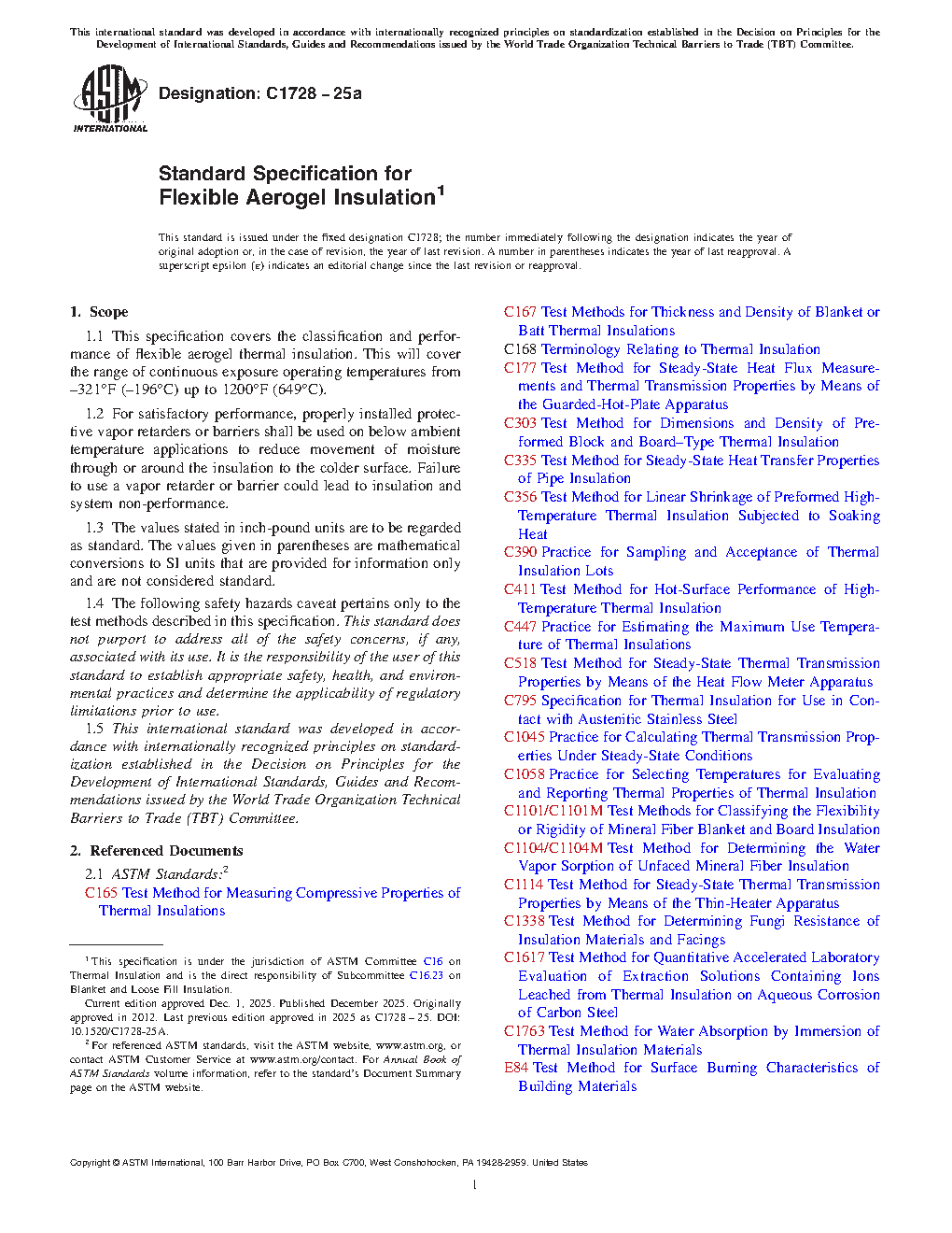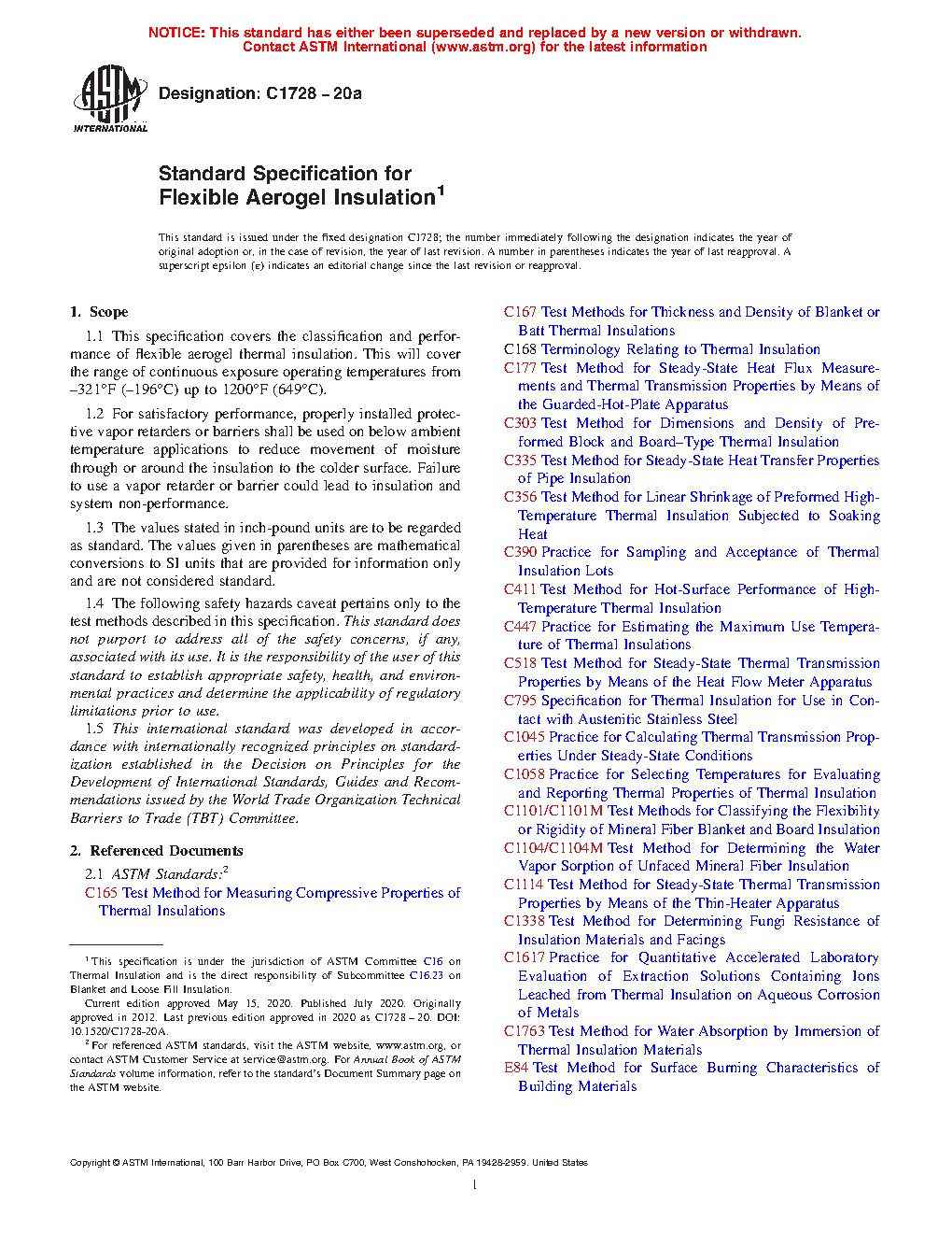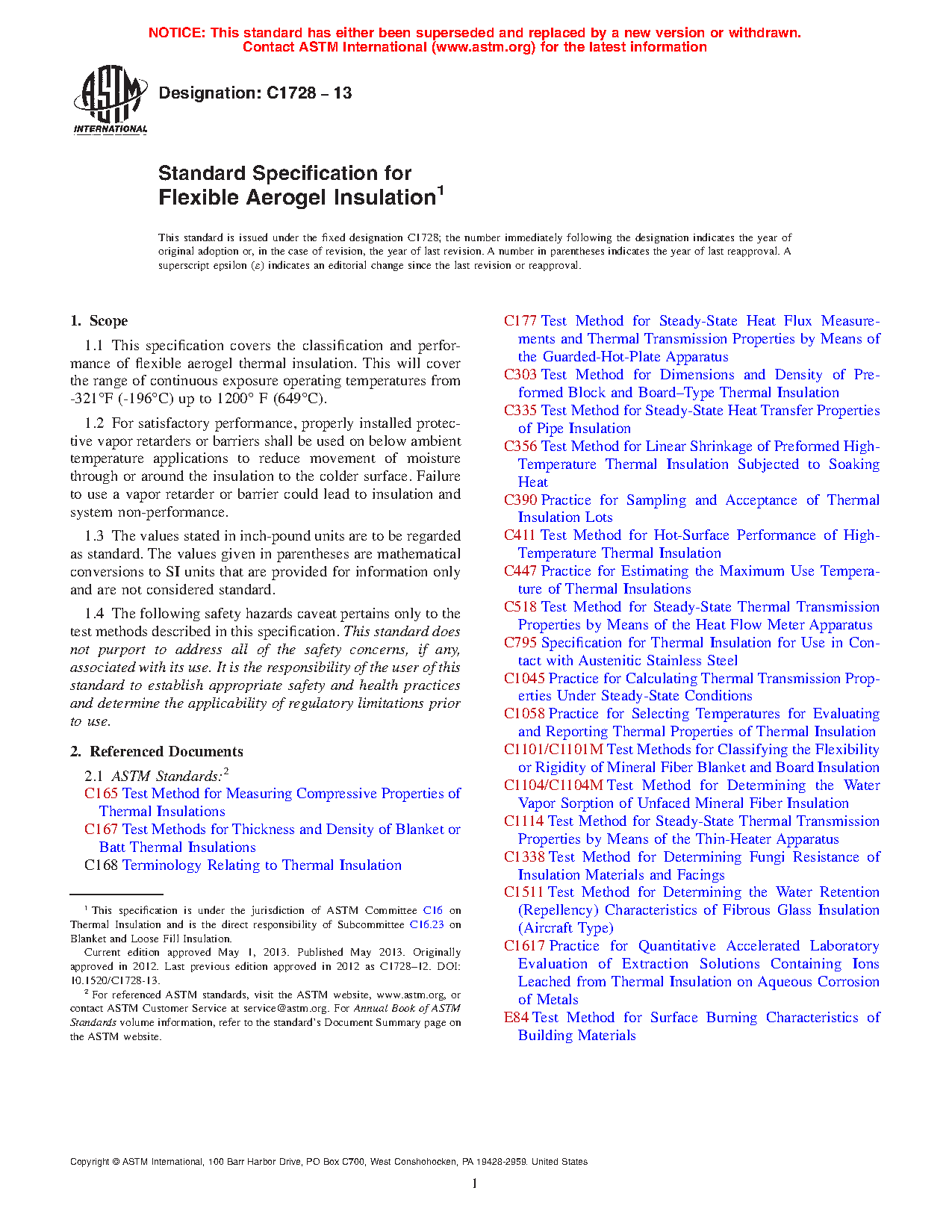 1.1 This specification covers the classification and performance of flexible aerogel thermal insulation. This will cover the range of continuous exposure operating temperatures from –321°F (–196°C) up to 1200°F (649°C).