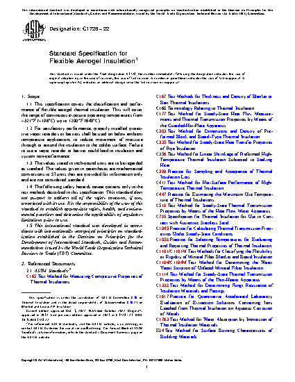 This specification covers the classification and performance of flexible aerogel thermal insulation. It indicates the mechanical, chemical, and property requirements of the flexible aerogel insulation, such as its thickness, density, and flexibility. It also lists the performance requirements for Types I, II, and III flexible aerogel insulation, and the acceptable dimensions and tolerances on flexible aerogel insulation sheets.