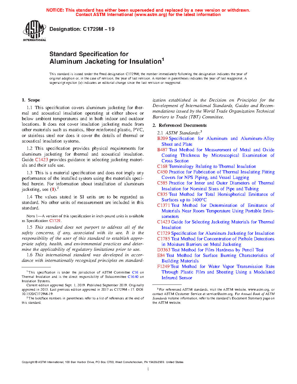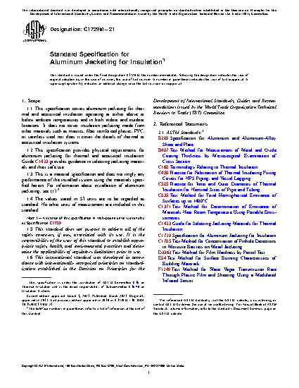 1.2 This specification provides physical requirements for aluminum jacketing for thermal and acoustical insulation. Guide C1423 provides guidance in selecting jacketing materials and their safe use.