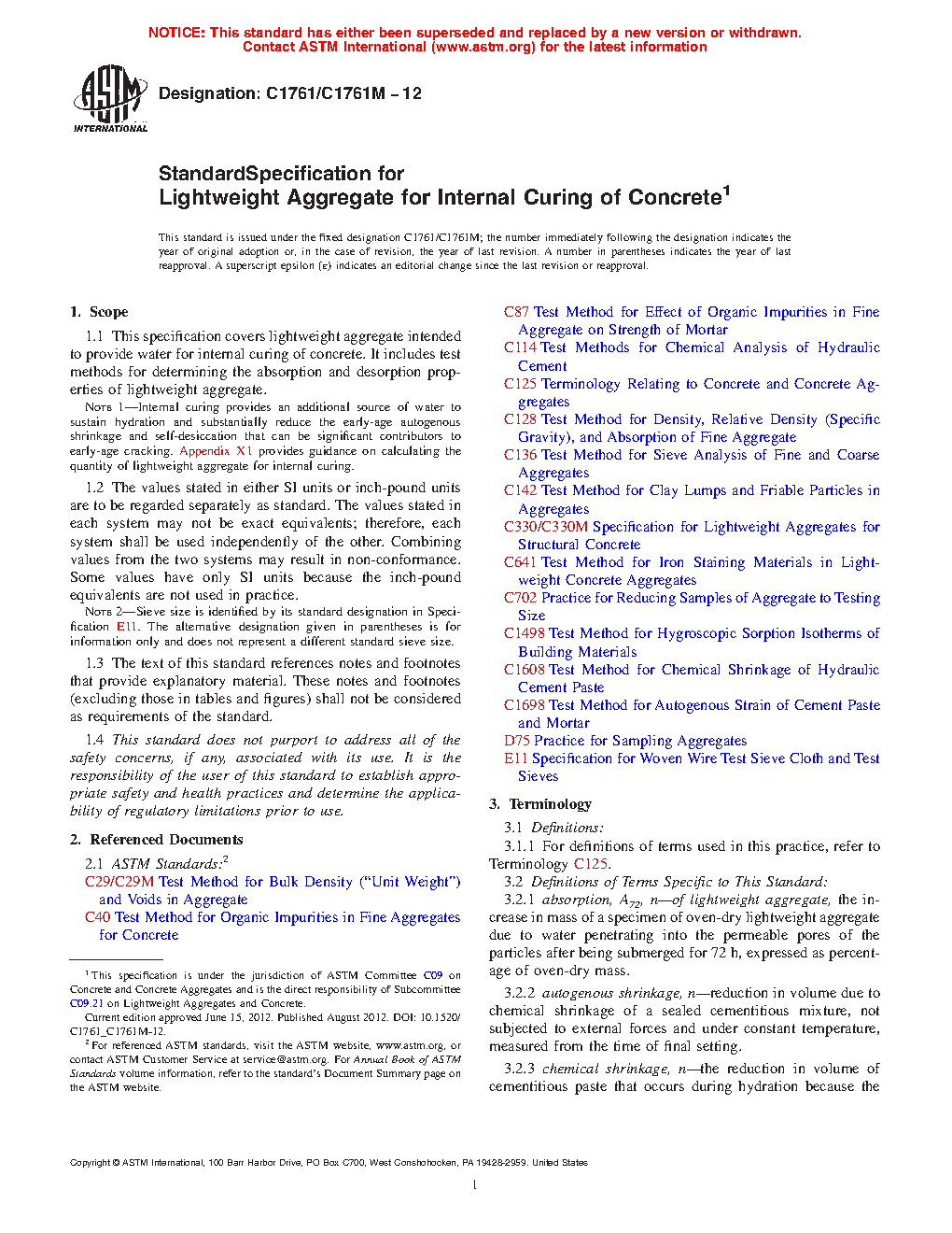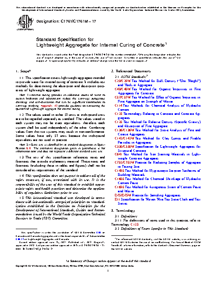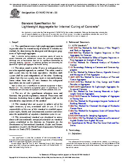 1.1 This specification covers lightweight aggregate intended to provide water for internal curing of concrete. It includes test methods for determining the absorption and desorption properties of lightweight aggregate.