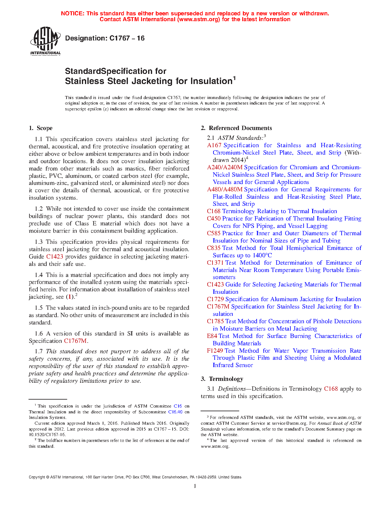 1.4 This is a material specification and does not imply any performance of the installed system using the materials specified herein. For information about installation of stainless steel jacketing, see (1).2