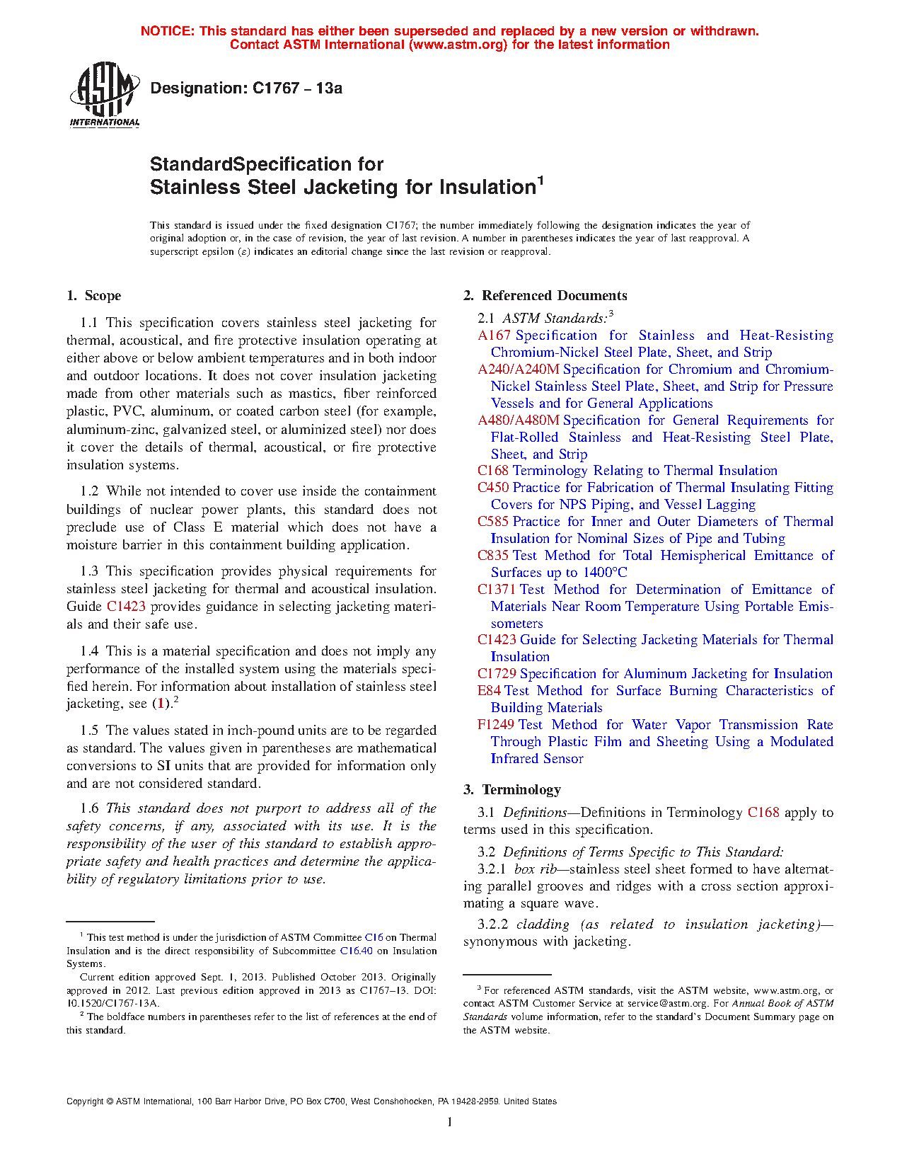 1.3 This specification provides physical requirements for stainless steel jacketing for thermal and acoustical insulation. Guide C1423 provides guidance in selecting jacketing materials and their safe use.