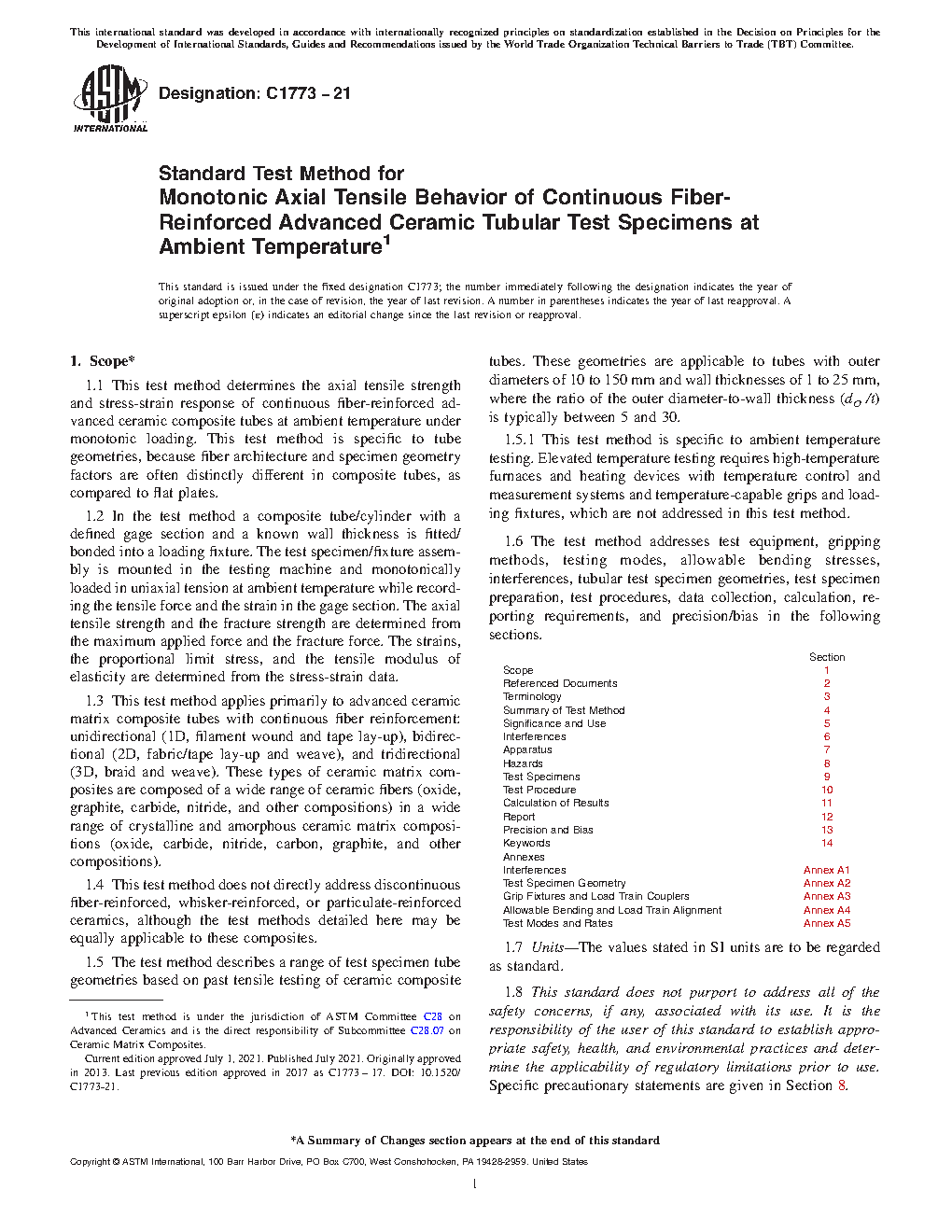 1.3 This test method applies primarily to advanced ceramic matrix composite tubes with continuous fiber reinforcement: unidirectional (1D, filament wound and tape lay-up), bidirectional (2D, fabric/tape lay-up and weave), and tridirectional (3D, braid and weave). These types of ceramic matrix composites are composed of a wide range of ceramic fibers (oxide, graphite, carbide, nitride, and other compositions) in a wide range of crystalline and amorphous ceramic matrix compositions (oxide, carbide, nitride, carbon, graphite, and other compositions).