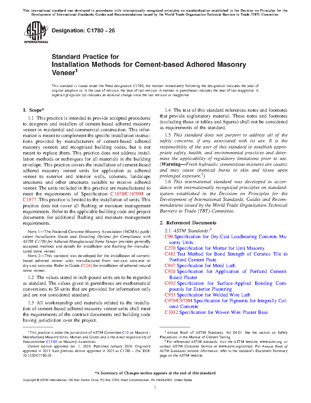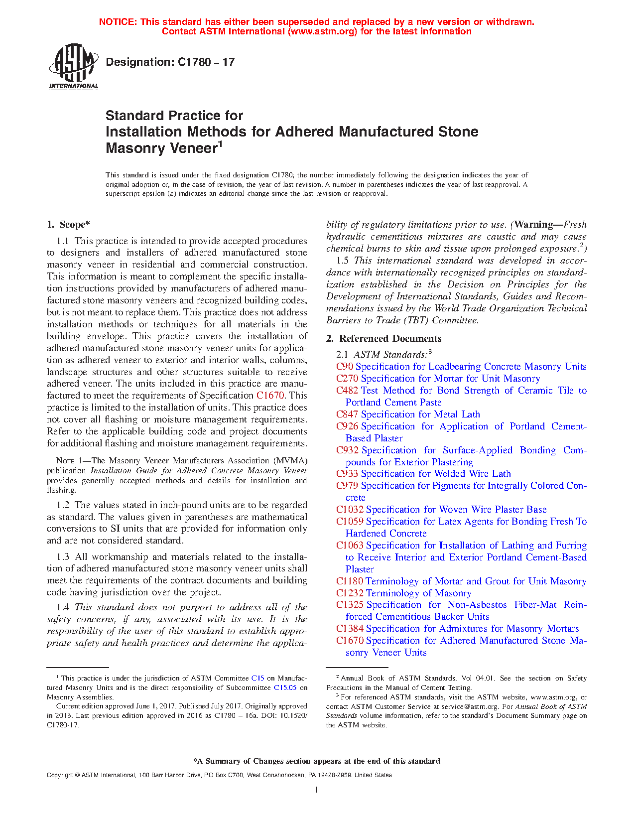 1.1 This practice is intended to provide accepted procedures to designers and installers of cement-based adhered masonry veneer in residential and commercial construction. This information is meant to complement the specific installation instructions provided by manufacturers of cement-based adhered masonry veneers and recognized building codes, but is not meant to replace them. This practice does not address installation methods or techniques for all materials in the building envelope. This practice covers the installation of cement-based adhered masonry veneer units for application as adhered veneer to exterior and interior walls, columns, landscape structures and other structures suitable to receive adhered veneer. The units included in this practice are manufactured to meet the requirements of Specification C1670/C1670M or C1877. This practice is limited to the installation of units. This practice does not cover all flashing or moisture management requirements. Refer to the applicable building code and project documents for additional flashing and moisture management requirements.