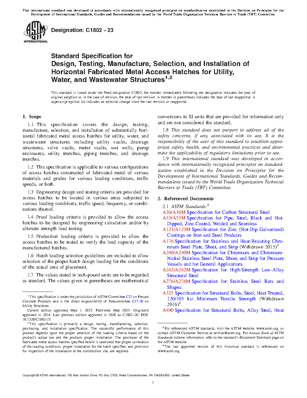 This specification covers the design, testing, manufacture, selection, and installation of fabricated metal access hatches for utility, water, and wastewater structures including utility vaults, drainage structures, valve vaults, meter vaults, wet wells, pump enclosures, utility trenches, piping trenches, and drainage trenches. It applies to various configurations of access hatches constructed of fabricated metal of various materials and grades for various loading conditions, traffic speeds, or both. It provides engineering design and testing criteria for access hatches to be located in various areas subjected to various loading conditions, traffic speed, frequency, or combinations thereof. It also includes production loading criteria to allow the access hatches to be tested in order to verify the load capacity of the manufactured hatches, as well as hatch loading selection guidelines to allow selection of the proper hatch design loading for the conditions of the actual area of placement. This specification also details requirements with respect to the acceptability of the access hatches, material certification and quality control, repairs, inspection, marking, optional features as part of the access hatch design, and submittal drawings.