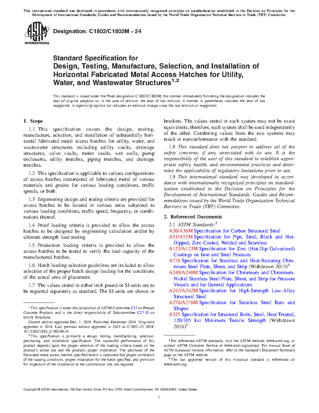 1.1 This specification covers the design, testing, manufacture, selection, and installation of substantially horizontal fabricated metal access hatches for utility, water, and wastewater structures including utility vaults, drainage structures, valve vaults, meter vaults, wet wells, pump enclosures, utility trenches, piping trenches, and drainage trenches.