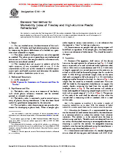 1.1 This test method covers the determination of the workability index of fireclay and high-alumina refractory plastics by measuring the plastic deformation of a molded test specimen when subjected to impacts.