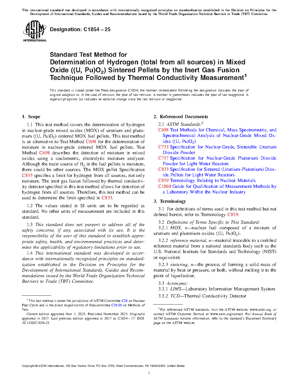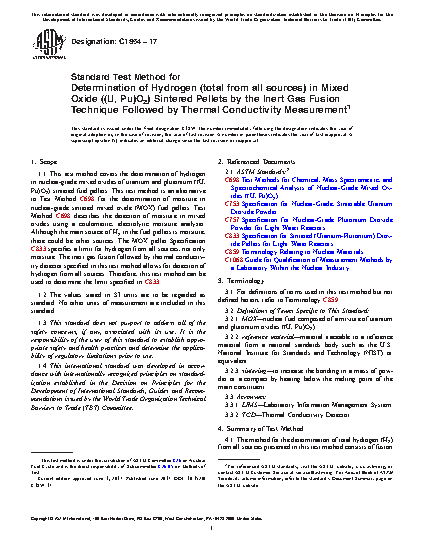 1.1 This test method covers the determination of hydrogen in nuclear-grade mixed oxides of uranium and plutonium ((U, Pu)O2) sintered fuel pellets. This test method is an alternative to Test Method C698 for the determination of moisture in nuclear-grade sintered mixed oxide (MOX) fuel pellets. Test Method C698 describes the detection of moisture in mixed oxides using a coulometric, electrolytic moisture analyzer. Although the main source of H2 in the fuel pellets is moisture, there could be other sources. The MOX pellet Specification C833 specifies a limit for hydrogen from all sources, not only moisture. The inert gas fusion followed by thermal conductivity detector specified in this test method allows for detection of hydrogen from all sources. Therefore, this test method can be used to determine the limit specified in C833.