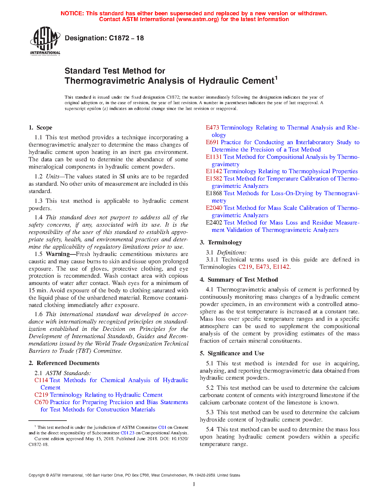 5.1 This test method is intended for use in acquiring, analyzing, and reporting thermogravimetric data obtained from hydraulic cement powders.