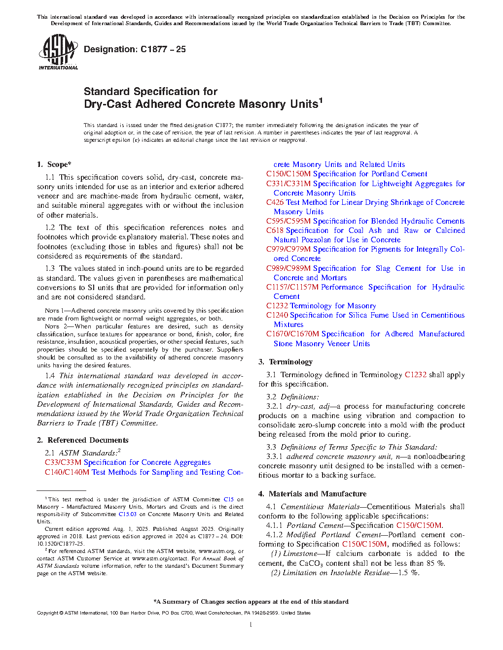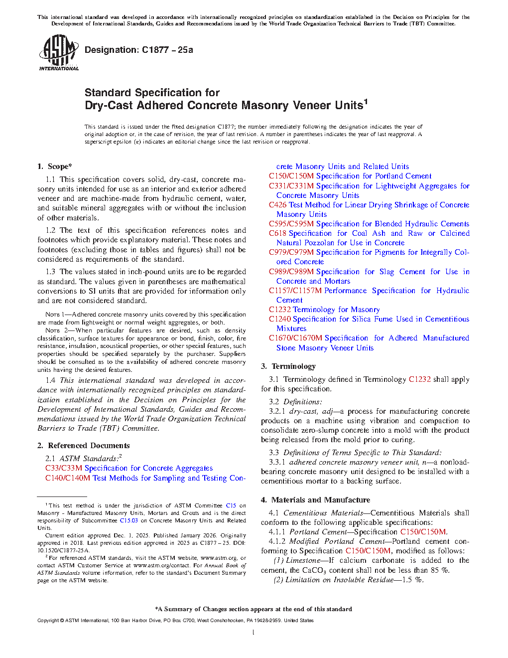 1.1 This specification covers solid, dry-cast, concrete masonry units intended for use as an interior and exterior adhered veneer and are made from portland cement, water, and suitable mineral aggregates with or without the inclusion of other materials.