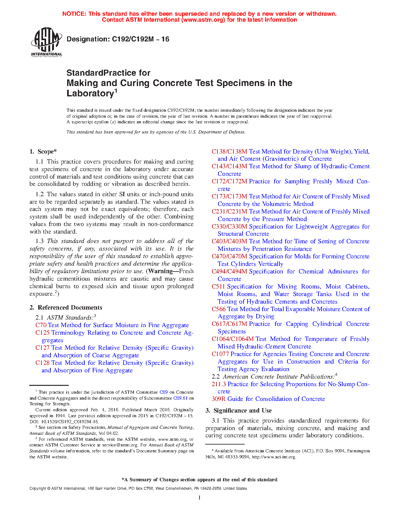 1.1 This practice covers procedures for making and curing test specimens of concrete in the laboratory under accurate control of materials and test conditions using concrete that can be consolidated by rodding or vibration as described herein.