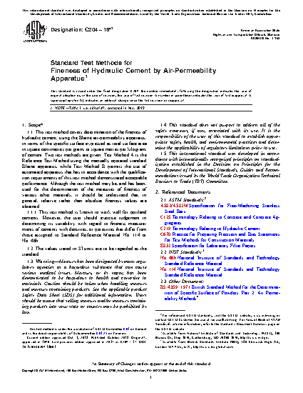 1.1 This test method covers determination of the fineness of hydraulic cement, using the Blaine air permeability apparatus, in terms of the specific surface expressed as total surface area in square centimetres per gram, or square meters per kilogram, of cement. Although the test method may be, and has been, used for the determination of the measures of fineness of various other materials, it should be understood that, in general, relative rather than absolute fineness values are obtained.