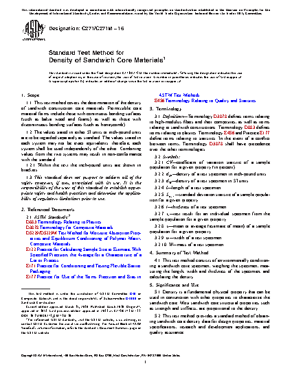 5.3 Factors that influence the density and shall therefore be reported include the following: core material, methods of material fabrication, core geometry (nominal cell size), specimen geometry, specimen preparation, methods of weight and dimensional measurement, specimen conditioning, and moisture content during weight and dimensional measurements.