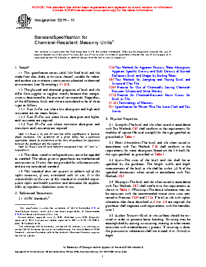 This specification covers chemical-resistant masonry units, specifically, solid kiln fired bricks and tiles made from clay, shale, or mixtures thereof, suitable for indoor and outdoor use in masonry construction subjected to chemical environments. The bricks and tiles are considered to be of three types as follows: Type I, for use where low absorption and high acid resistance are not major factors; Type II, for use where lower absorption and higher acid resistance are required; and Type III, for use where minimum absorption and maximum acid resistance are required. The masonry units shall undergo tests and adhere accordingly to the following physical and chemical requirements: water absorption, warpage, surface texture, size and dimension, flexural strength, modulus of rupture, sulfuric acid solubility, and percent weight loss.