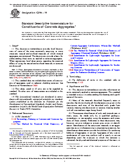 Note 1-These descriptions characterize minerals and rocks as they occur in nature and do not include blast-furnace slag or lightweight aggregates that are prepared by the alteration of the structure and composition of natural material. Blast-furnace slag is defined in Definitions C125. Information about lightweight aggregates is given in Specifications C330, C331, and C332.1.2 The accurate identification of rocks and minerals can, in many cases, be made only by a qualified geologist, mineralogist, or petrographer using the apparatus and procedures of these sciences. Reference to these descriptions may, however, serve to indicate or prevent gross errors in identification. Identification of the constituent materials in an aggregate may assist in recognizing its properties, but identification alone cannot provide a basis for predicting the behavior of aggregates in service. Mineral aggregates composed of any type or combination of types of rocks and minerals may perform well or poorly in service depending upon the exposure to which they are subjected, the physical and chemical properties of the matrix in which they are embedded, their physical condition at the time they are used, and other factors. Small amounts of minerals or rocks that may occur only as contaminants or accessories in the aggregate may decisively influence its quality.