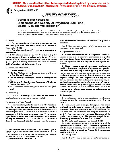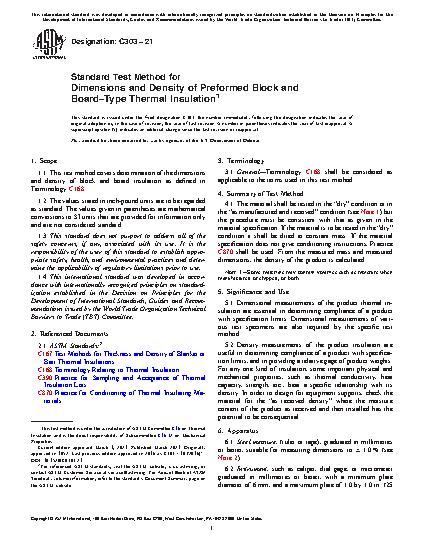 5.2 Density measurements of the product insulation are useful in determining compliance of a product with specification limits, and in providing a relative gage of product weights. For any one kind of insulation, some important physical and mechanical properties, such as thermal conductivity, heat capacity, strength, etc., bear a specific relationship with its density. In order to design for equipment supports, check the material for the “as received density” where the moisture content of the product as received and then installed has the potential to be consequential.