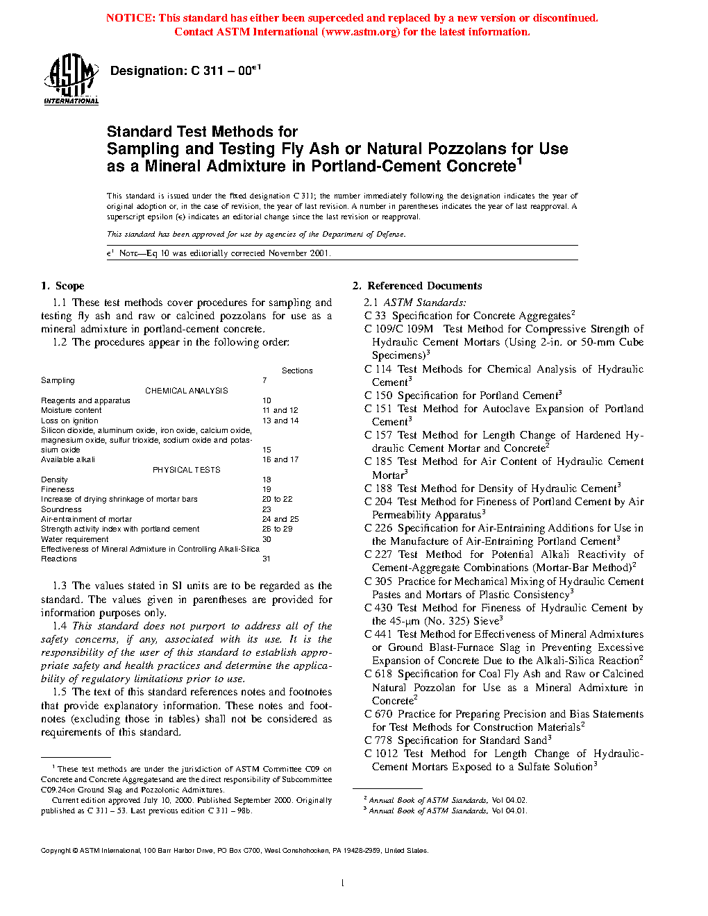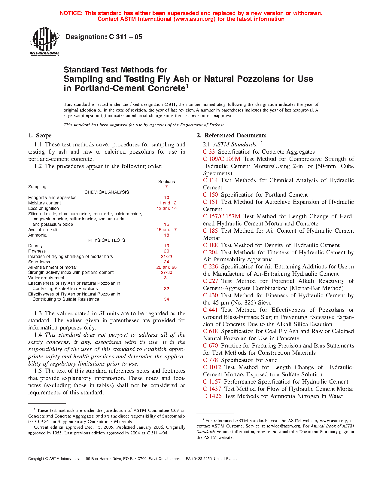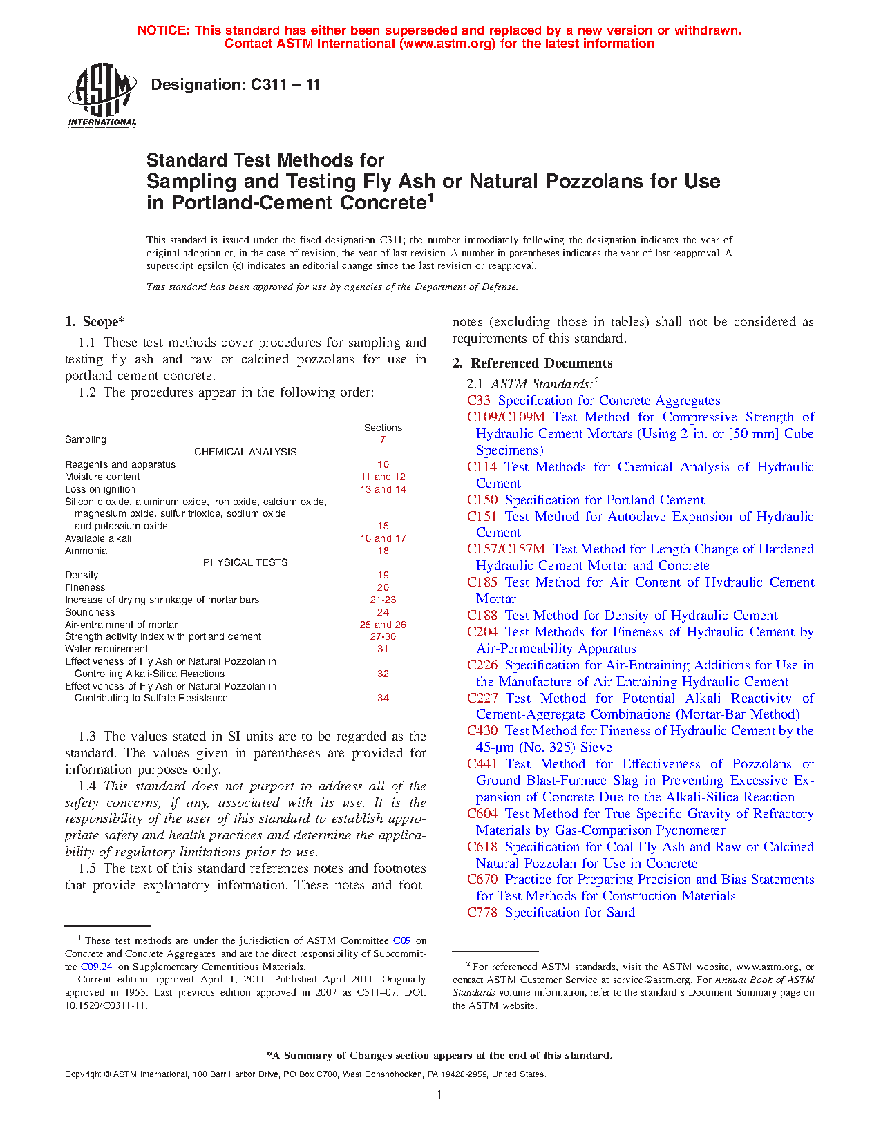 1.1 These test methods cover procedures for sampling and testing fly ash and raw or calcined pozzolans for use as a mineral admixture in portland-cement concrete.