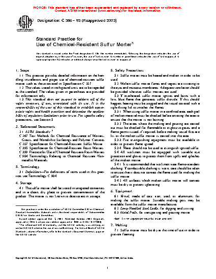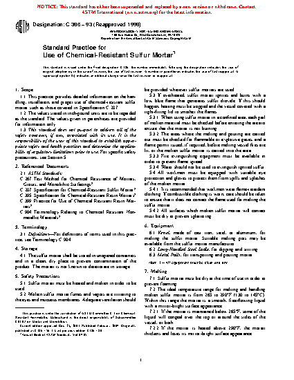 1.1 This practice provides detailed information on the handling, installation, and proper use of chemical-resistant sulfur mortar such as those covered in Specification C 287.