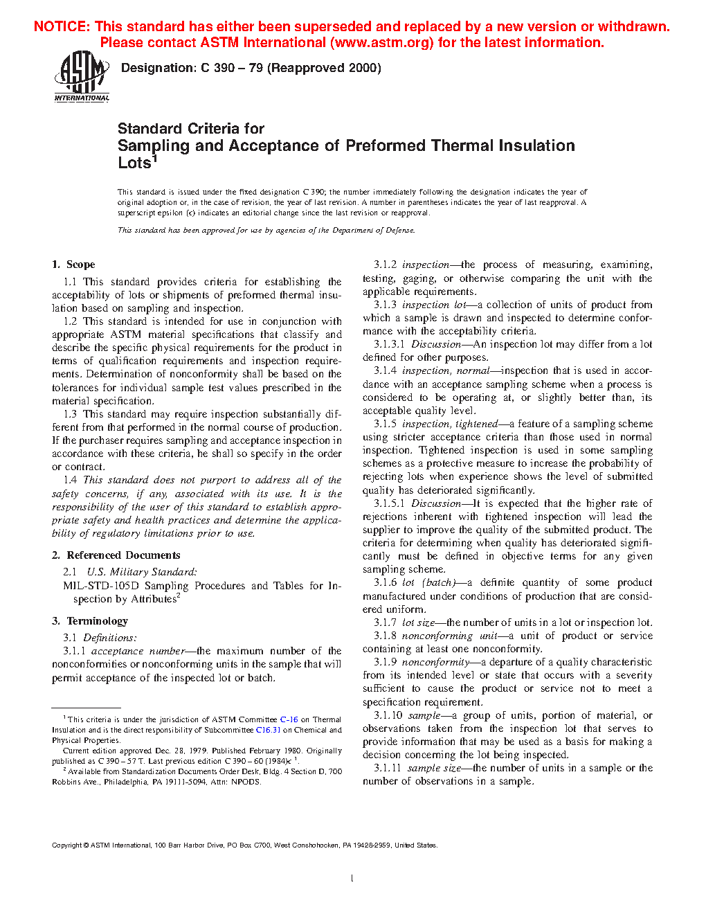 1.1 This practice covers criteria for establishing the acceptability of lots of shipments of preformed board, preformed block and pipe, and batts and blanket thermal insulation based on sampling and inspection.