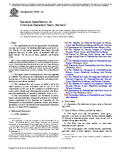 This specification covers the requirements for chemical-resistant resin mortars for bonding chemical-resistant brick or tile. Mortars of this group generally have better physical properties and resist a wider variety of chemicals than inorganic mortars. The liquid resin may be phenolic, furan epoxy, polyester, vinyl ester, or some other resinous material capable of forming a chemical-resistant mortar when mixed with a suitable setting agent and filler. The fillers may be silica, carbon, or some other chemical-resistant material. The setting agents may include amines, polyamides, peroxides, acids or other reactants. Setting agents may be supplied as a separate component to be incorporated into the resin and filler at the time of mixing or may be supplied as a constituent of the filler. The resin shall be tested and should conform to the specified values of viscosity, chemical resistance, working life and setting time, tensile strength, compressive strength, bond strength, shrinkage, and absorption.