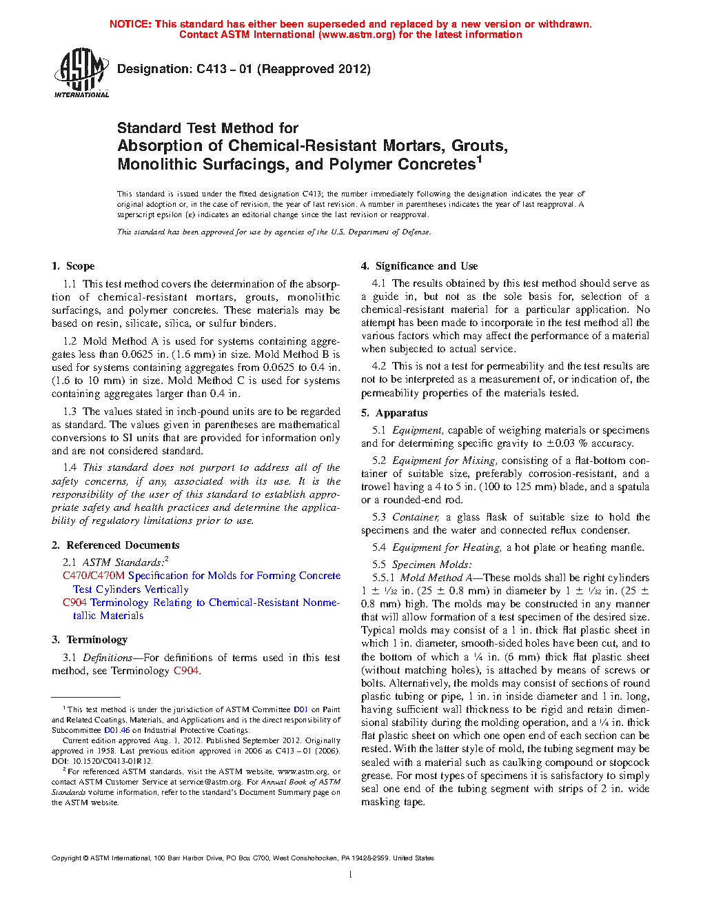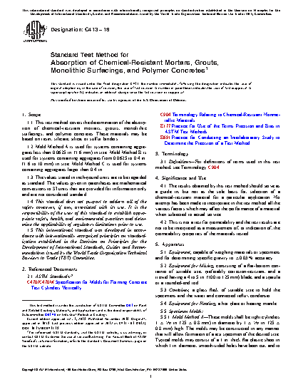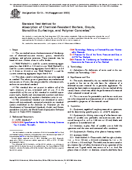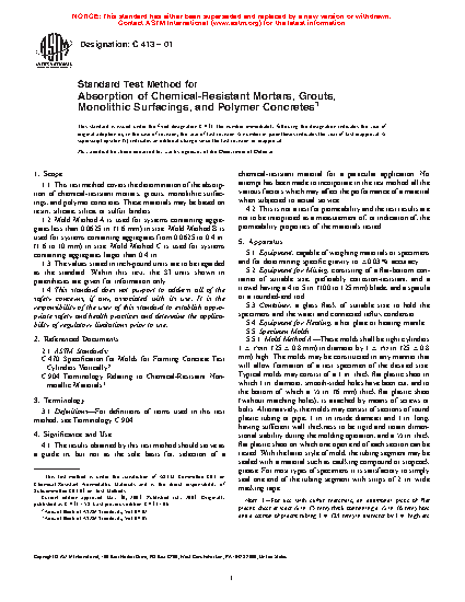1.1 This test method covers the determination of the absorption of chemical-resistant mortars, grouts, monolithic surfacings, and polymer concretes. These materials may be based on resin, silicate, silica, or sulfur binders.