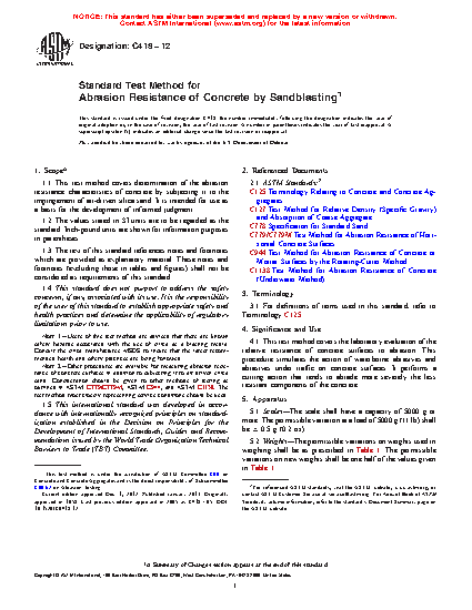 Note 2: Other procedures are available for measuring abrasion resistance of concrete surfaces in addition to subjecting it to air driven silica sand. Consideration should be given to other methods of testing as outlined in Test Methods C779/C779M, C944/C944M, and C1138M. The test method most closely representing service conditions should be used.