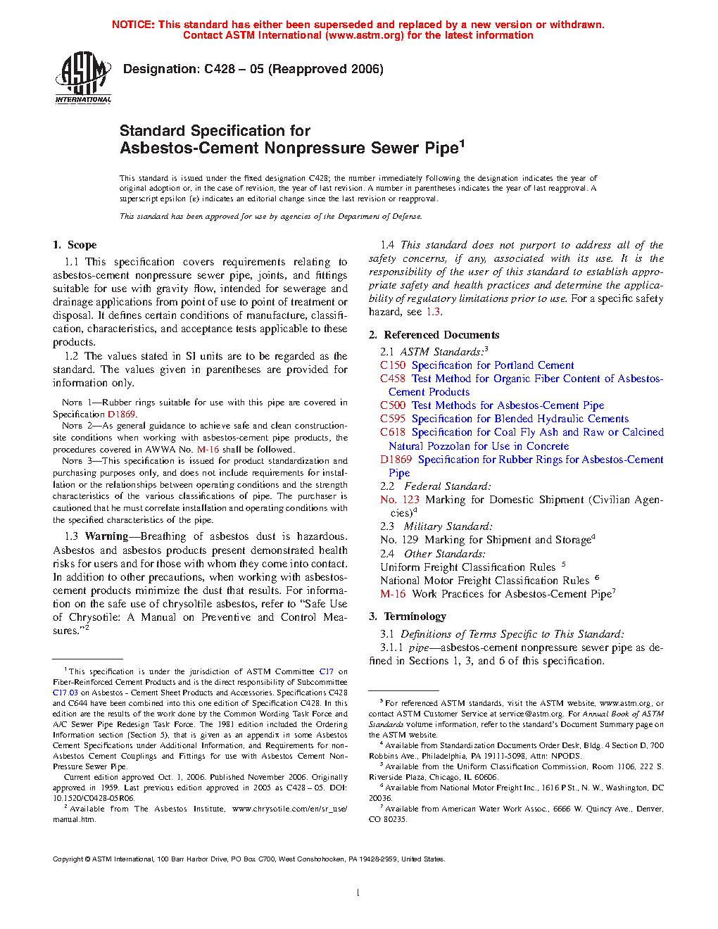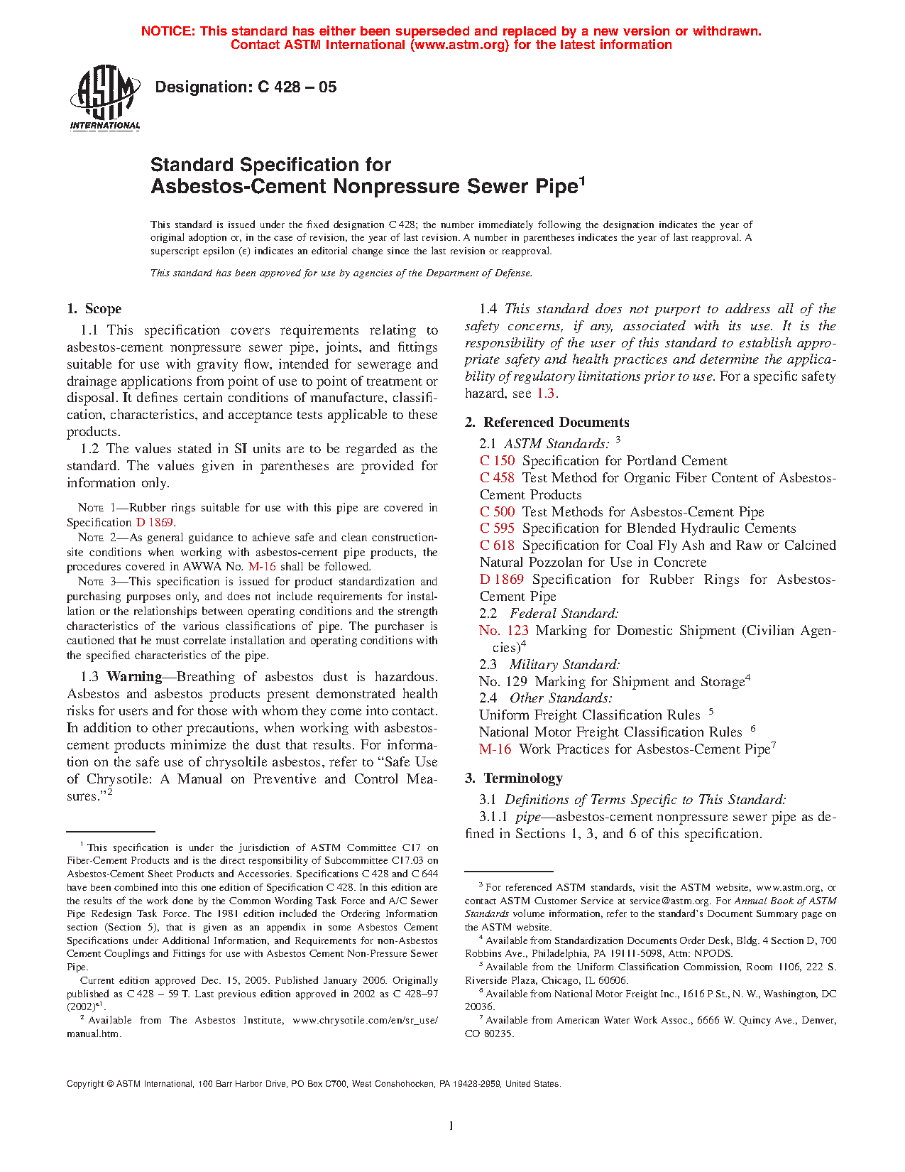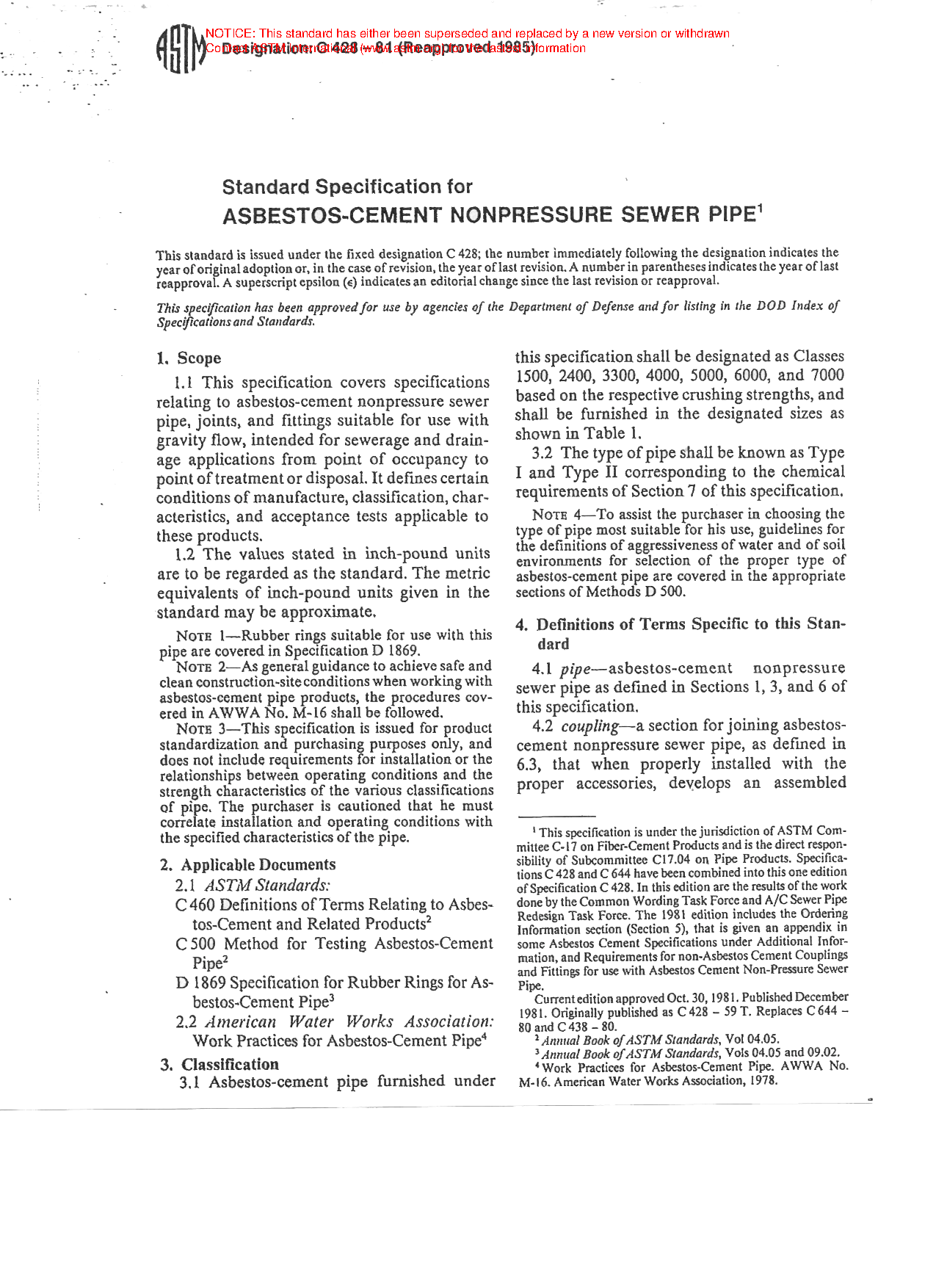 1.1 This specification covers requirements relating to asbestos-cement nonpressure sewer pipe, joints, and fittings suitable for use with gravity flow, intended for sewerage and drainage applications from point of use to point of treatment or disposal. It defines certain conditions of manufacture, classification, characteristics, and acceptance tests applicable to these products.