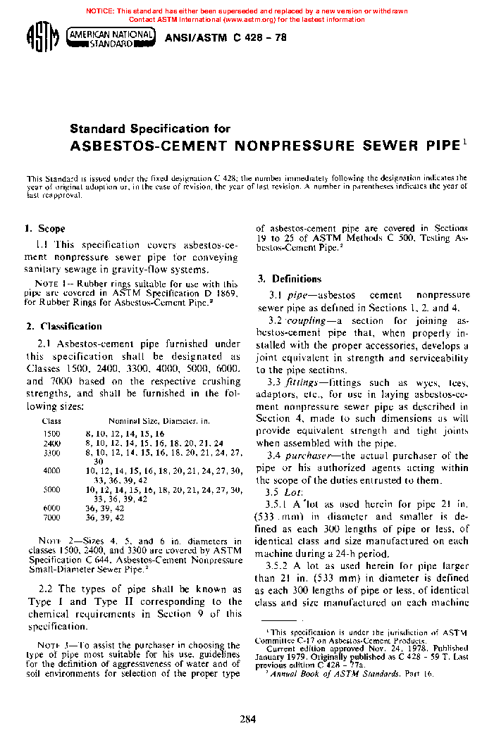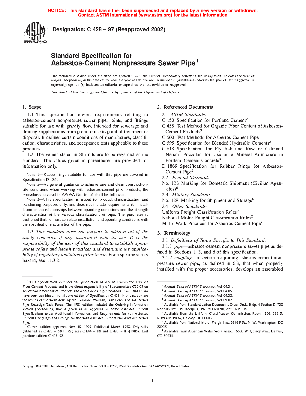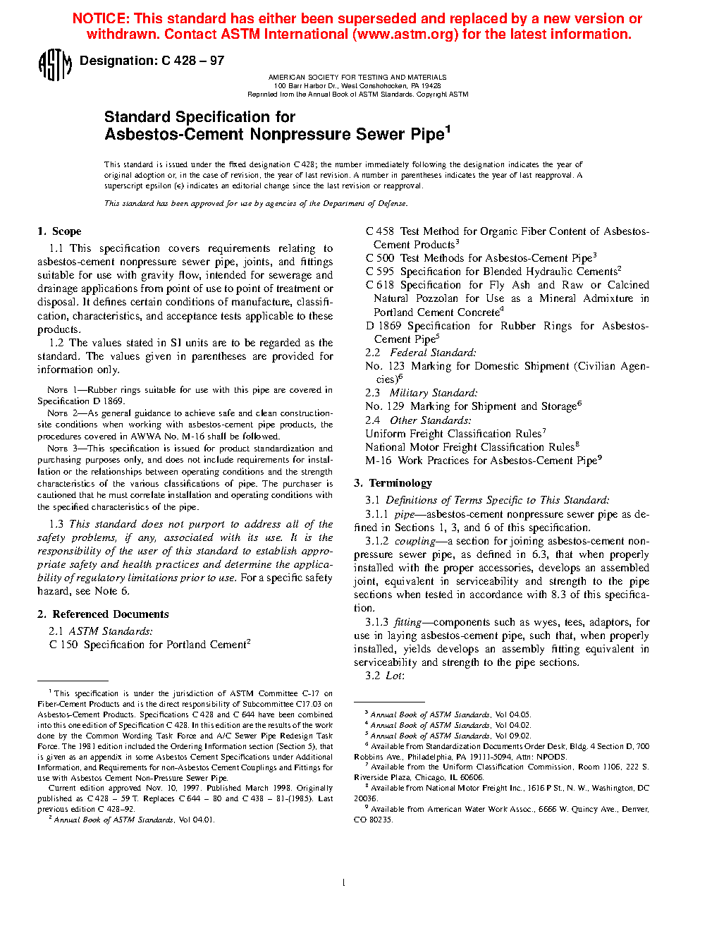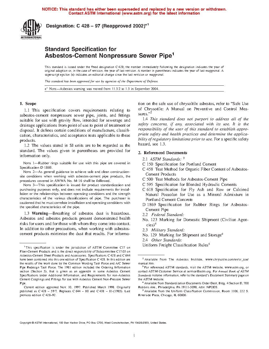 1.1 This specification covers requirements relating to asbestos-cement nonpressure sewer pipe, joints, and fittings suitable for use with gravity flow, intended for sewerage and drainage applications from point of use to point of treatment or disposal. It defines certain conditions of manufacture, classification, characteristics, and acceptance tests applicable to these products.