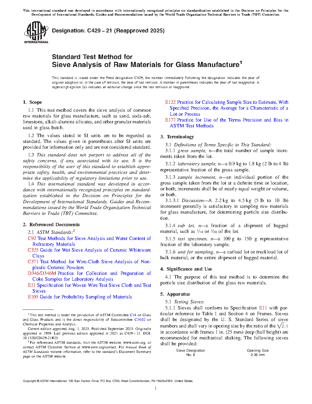 1.1 This test method covers the sieve analysis of common raw materials for glass manufacture, such as sand, soda-ash, limestone, alkali-alumina silicates, and other granular materials used in glass batch.