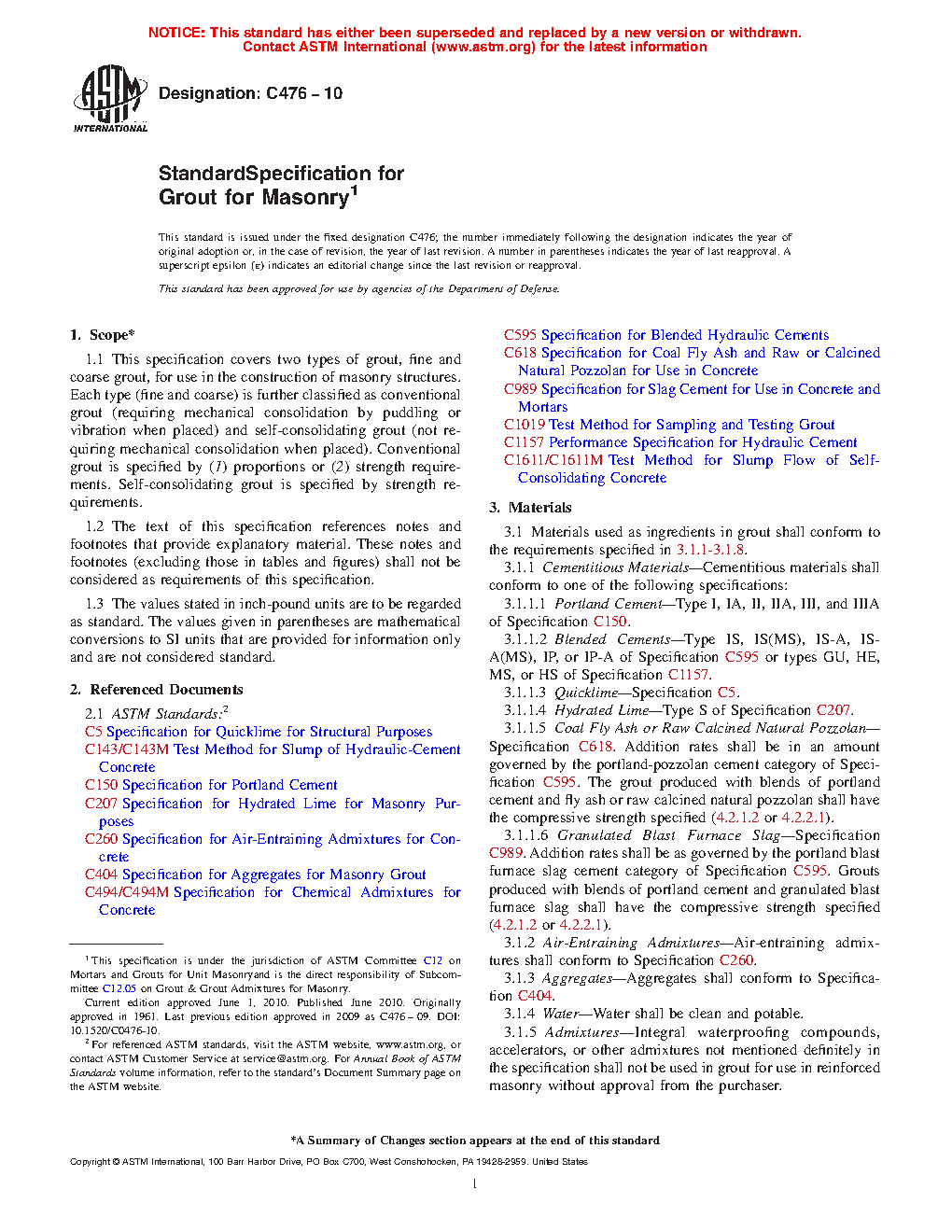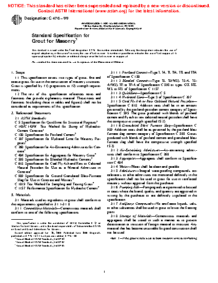 1.1 This specification covers two types of grout, fine and coarse grout, for use in the construction of masonry structures. Each type (fine and coarse) is further classified as conventional grout (requiring mechanical consolidation by puddling or vibration when placed) and self-consolidating grout (not requiring mechanical consolidation when placed). Conventional grout is specified by (1) proportions or (2) strength requirements. Self-consolidating grout is specified by strength requirements.