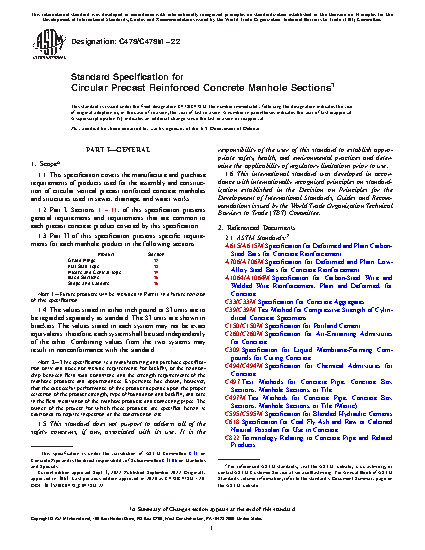 1.2 Part I, Sections 1 – 11, of this specification presents general requirements and requirements that are common to each precast concrete product covered by this specification.