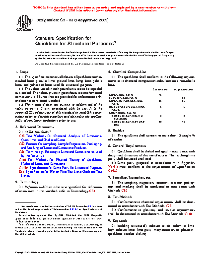 Standard Specification for Quicklime for Structural Purposes