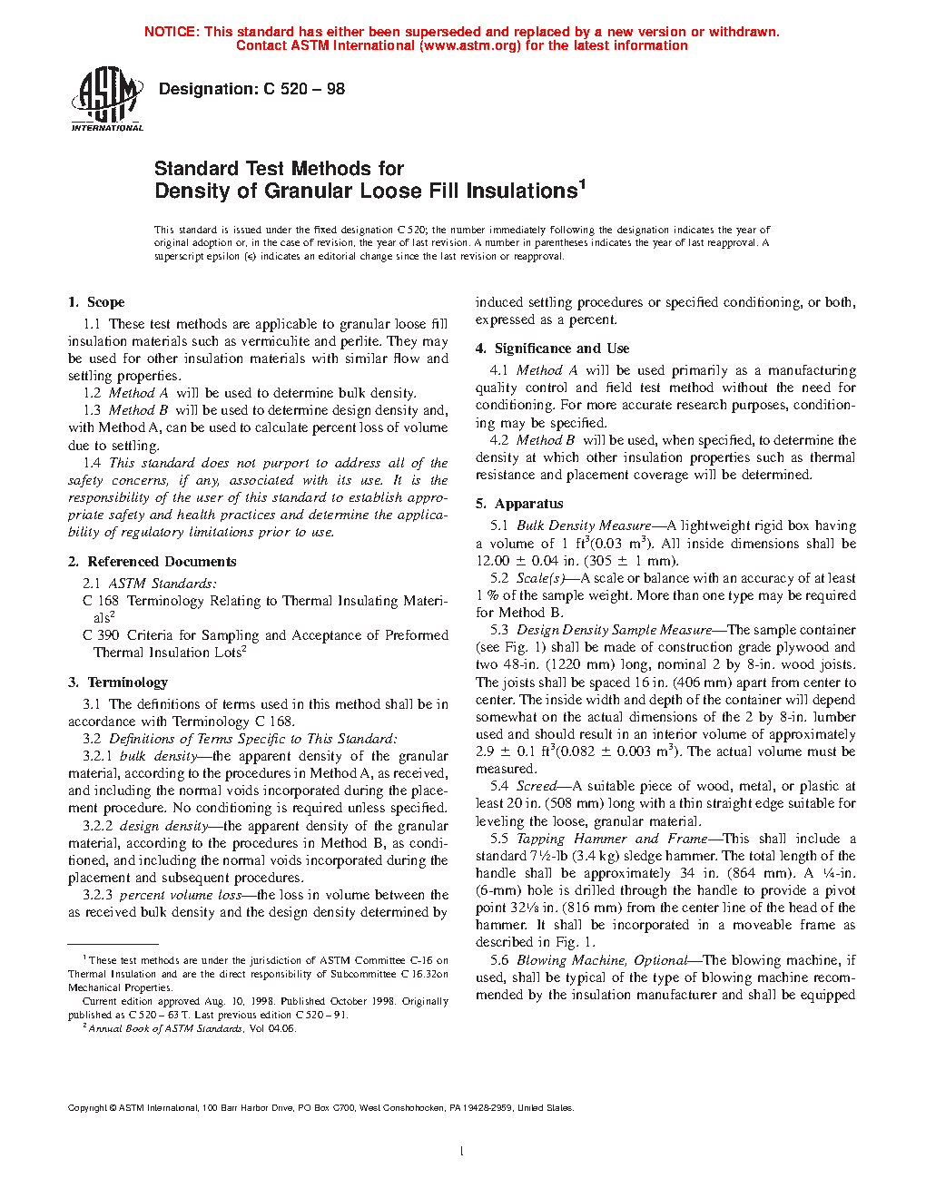 1.1 These test methods are applicable to granular loose fill insulation materials such as vermiculite and perlite. They are used for other insulation materials with similar flow and settling properties.