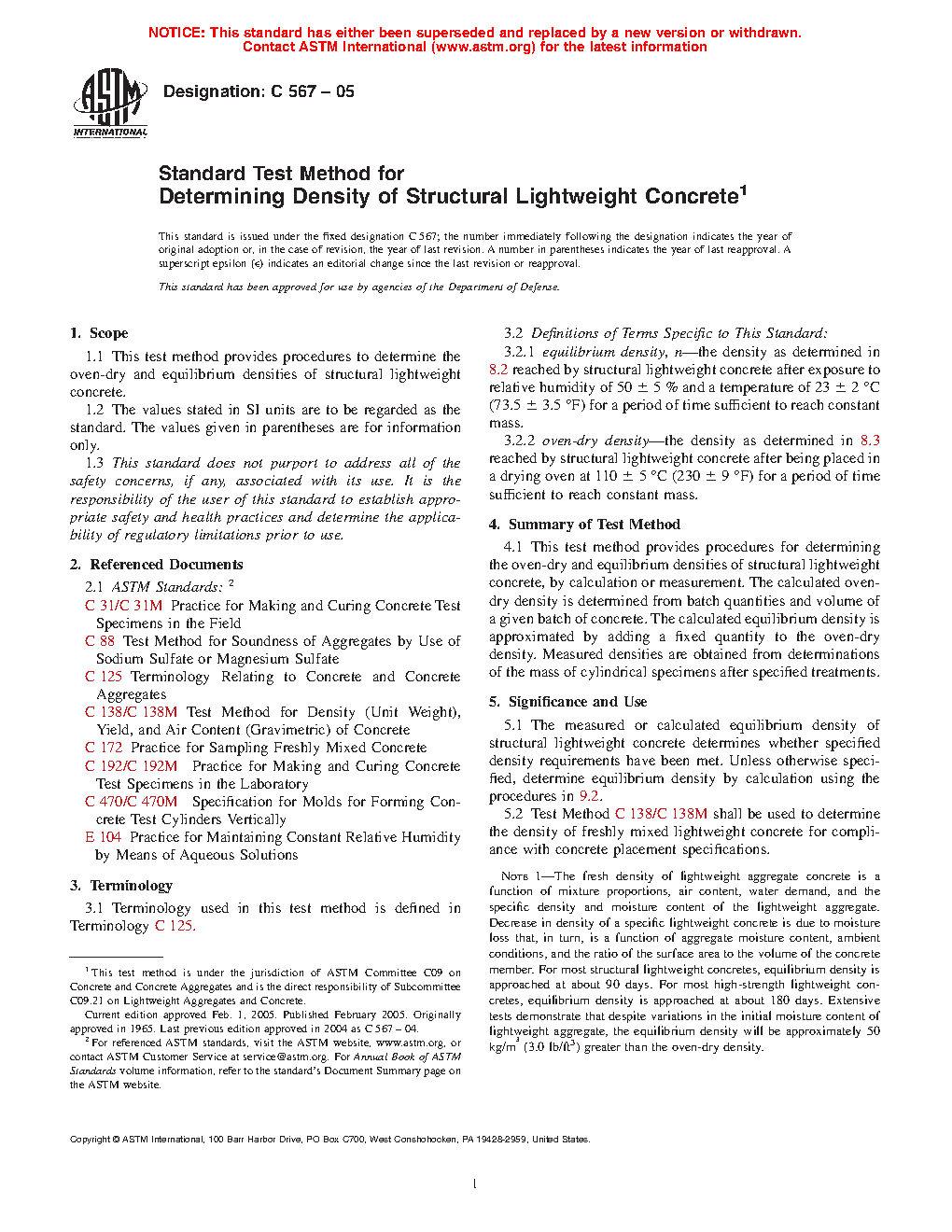 1.1 This test method provides procedures to determine the oven-dry and equilibrium densities of structural lightweight concrete.