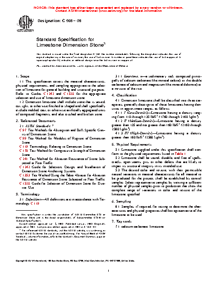 1.1 This specification covers the material characteristics, physical requirements, and sampling appropriate to the selection of limestone for general building and structural purposes. Refer to Guides C 1242