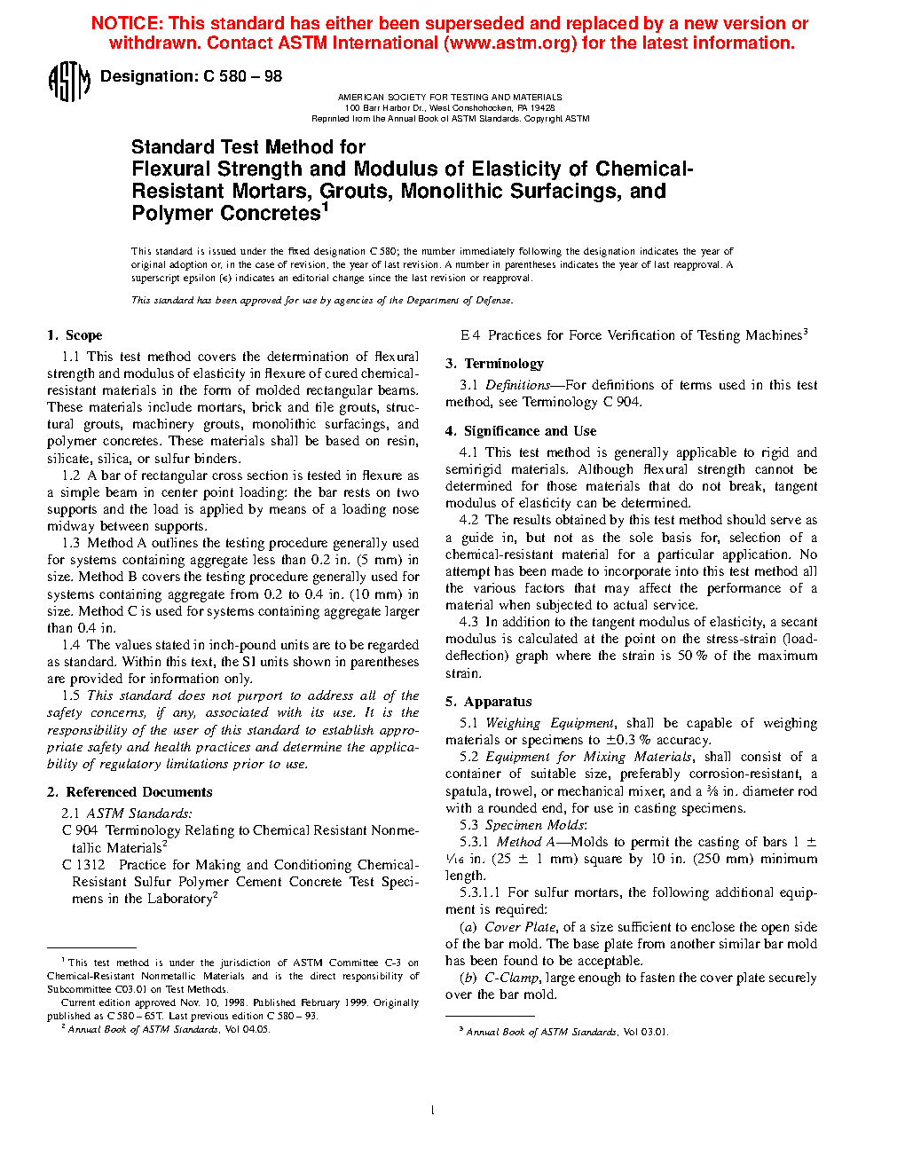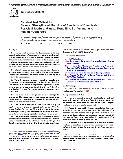 1.1 This test method covers the determination of flexural strength and modulus of elasticity in flexure of cured chemical-resistant materials in the form of molded rectangular beams. These materials include mortars, brick and tile grouts, structural grouts, machinery grouts, monolithic surfacings (60 mils or greater), and polymer concretes. These materials shall be based on resin, silicate, silica, or sulfur binders.