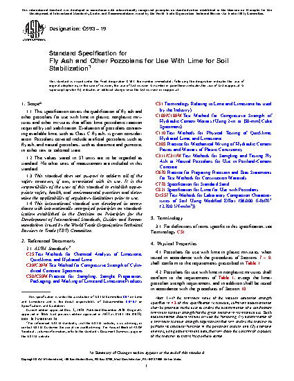 1.1 This specification covers the qualification of fly ash and other pozzolans for use with lime in plastic, nonplastic mixtures and other mixtures that affect lime pozzolanic reaction required by soil stabilization. Evaluation of pozzolans containing available lime, such as Class C fly ash, is given consideration. Pozzolans covered include artificial pozzolans such as fly ash, and natural pozzolans, such as diatomite and pumicite, in either raw or calcined state.